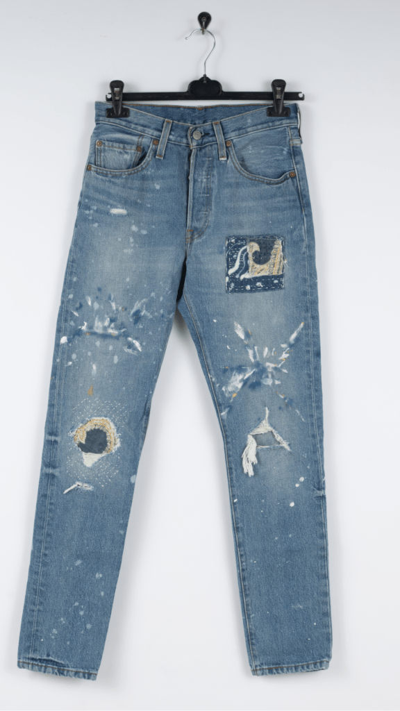 I hunt for vintage Levi’s in great condition—soft, worn-in denim with stories to tell. These jeans aren’t just secondhand—they’re raw canvas. Once they land in my studio, I funk them up with a mix of dye, bleach, paint, and sashiko-inspired stitching. Every pair is one-of-a-kind and artistically reimagined.